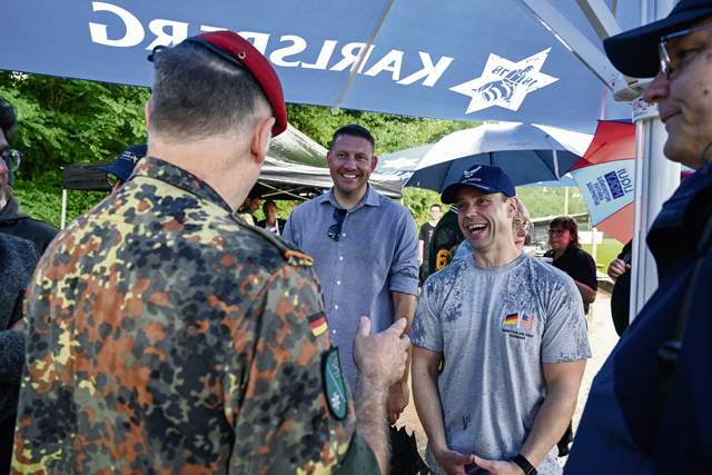 U.S. Air Force Col. Michael Garrott, right, 521st Air Mobility Operations Wing deputy commander, and USAF Chief Master Sgt. Jared Roman, center, 435th Air Ground Operations Wing command chief, talk to German Bundeswehr Oberst (Col) Uwe Staab, State Command of Saarland commander, at the Saarlouis Hornets German Veterans Day baseball game in Saarlouis, Germany, June 15, 2025. To help celebrate Germany’s first Veterans Day, the team invited local U.S. military leaders to attend the game with local German Bundeswehr members, with the highest-ranking members being asked to throw out the first pitch. (U.S. Air Force photo by Staff Sgt. Joshua T. Crossman)