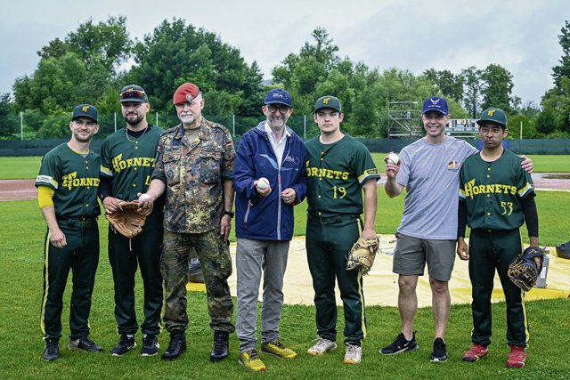 German Bundeswehr Oberst (Col.) Uwe Staab, State Command of Saarland commander, Reinhold Jost, Saarland’s Interior and Sports Minister, and U.S. Air Force Col. Michael Garrott, 521st Air Mobility Operations Wing deputy commander, pose for a photo with players of the Saarlouis Hornets at the teams German Veterans Day baseball game in Saarlouis, Germany, June 15, 2025. To help celebrate Germany’s first Veterans Day, the team invited local U.S. military leaders to attend the game with local German Bundeswehr members, with the highest-ranking members being asked to throw out the first pitch. (U.S. Air Force photo by Staff Sgt. Joshua T. Crossman)
