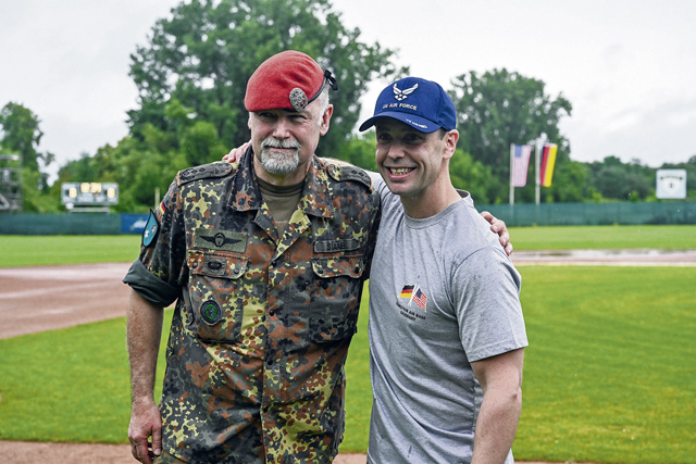U.S. Air Force Col. Michael Garrott, 521st Air Mobility Operations Wing deputy commander, embraces Reinhold Jost, Saarland’s Interior and Sports Minister, at the Saarlouis Hornets German Veterans Day baseball game in Saarlouis, Germany, June 15, 2025. To help celebrate Germany’s first Veterans Day, the team invited local U.S. military leaders to attend the game with local German Bundeswehr members, with the highest-ranking members being asked to throw out the first pitch. (U.S. Air Force photo by Staff Sgt. Joshua T. Crossman)