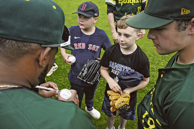 Military children from Ramstein Air Base, Germany, have their baseballs signed by players of the Saarlouis Hornets at the teams German Veterans Day baseball game in Saarlouis, Germany, June 15, 2025. To help celebrate Germany’s first Veterans Day, the team invited local U.S. military leaders to attend the game with local German Bundeswehr members, with the highest-ranking members being asked to throw out the first pitch. (U.S. Air Force photo by Staff Sgt. Joshua T. Crossman)