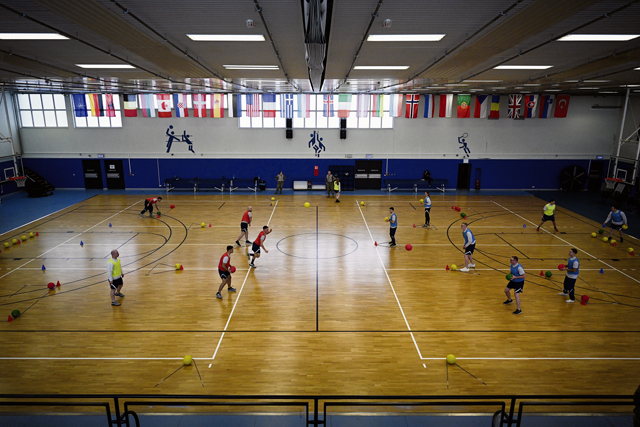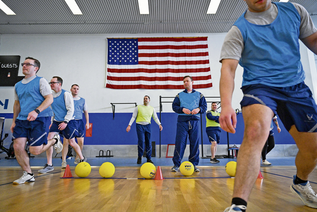 Airmen assigned to the 521st Air Mobility Operations Wing begin a game of FLEX Ball at the Vogelweh Fitness Center on Kapaun Air Station, Germany, Feb. 20, 2025. Standing for “functional leader exercise”, FLEX Ball uses the quick decision making needed in athletics to teach lessons in war fighting by simulating ground to air as well as air to ground executions, with the objective of taking over the battlefield by gaining air superiority. (U.S. Air Force photo by Staff Sgt. Joshua T. Crossman)