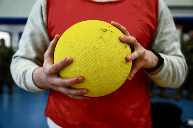 An Airman assigned to the 521st Air Mobility Operations Wing holds a dodgeball during a game of FLEX Ball at the Vogelweh Fitness Center on Kapaun Air Station, Germany, Feb. 20, 2025. Standing for “functional leader exercise”, FLEX Ball uses the quick decision making needed in athletics to teach lessons in war fighting by simulating ground to air as well as air to ground executions, with the objective of taking over the battlefield by gaining air superiority. (U.S. Air Force photo by Staff Sgt. Joshua T. Crossman)