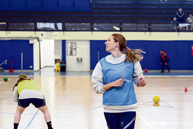 Maj. Rachel Smith, 721st Aerial Port Squadron director of operations, runs during a game of FLEX Ball at the Vogelweh Fitness Center on Kapaun Air Station, Germany, Feb. 20, 2025. Standing for “functional leader exercise”, FLEX Ball uses the quick decision making needed in athletics to teach lessons in war fighting by simulating ground to air as well as air to ground executions, with the objective of taking over the battlefield by gaining air superiority. (U.S. Air Force photo by Staff Sgt. Joshua T. Crossman)