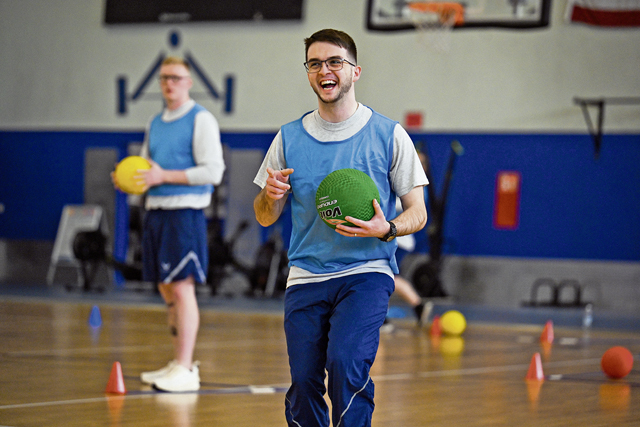An Airman assigned to the 521st Air Mobility Operations Wing laughs and points during a game of FLEX Ball at the Vogelweh Fitness Center on Kapaun Air Station, Germany, Feb. 20, 2025. Standing for “functional leader exercise”, FLEX Ball uses the quick decision making needed in athletics to teach lessons in war fighting by simulating ground to air as well as air to ground executions, with the objective of taking over the battlefield by gaining air superiority. (U.S. Air Force photo by Staff Sgt. Joshua T. Crossman)