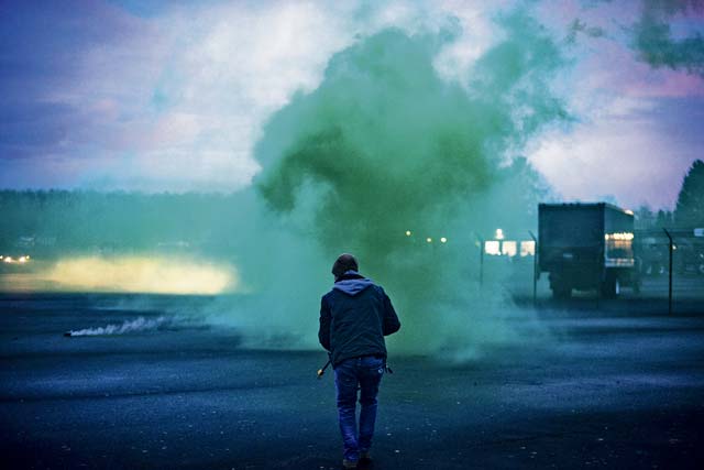 A U.S. Air Force Airmen assigned to the 86th Airlift Wing Opposing Forces team advances on 569th U.S. Forces Police Squadron members during a simulated ground attack as part of exercise Operation Varsity 19-04 at Kapaun Air Station, Dec. 11. The simulation included the use of smoke grenades, blank rounds, and various assault rifles to enhance the realism of the exercise. Photo by Staff Sgt. Devin Boyer