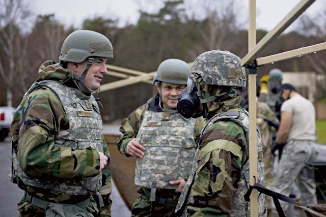 U.S. Air Force Brig. Gen. Mark R. August, 86th Airlift Wing commander, left, and Chief Master Sgt. Ernesto J. Rendon, 86th AW command chief, speak to Airman 1st Class Sean Hurley, 786th Civil Engineer Squadron emergency management training journeyman, about the importance of preparedness and emergency response at Ramstein Air Base, Dec 11. The 86th AW participated in Operation Varsity 19-04 to promote readiness among Airmen.