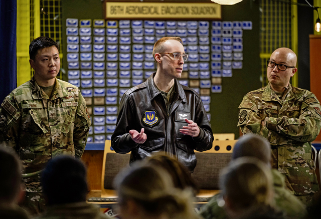U.S. Air Force Staff Sgt. Jooho Park, 86th Aeromedical Evacuation Squadron technician, U.S. Air Force Master Sgt. Brian McGinnis, 86th AES flight chief of operations, and U.S. Air Force Maj. James Brown, 86th Medical Squadron Critical Care Air Transport Team nurse, brief participants of the 68T Army Symposium annual training about the mission of the 86th AES at Ramstein Air Base, Germany, Feb. 5, 2025. The symposium took place from Feb. 3-7, 2025. This was the first symposium that incorporated the CCATT, 86th AES and animal care specialists, providing familiarity for the service members on the entire continuum of care for a military working dog. (U.S. Air Force photo by Senior Airman Jared Lovett)