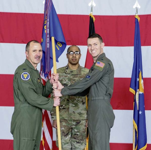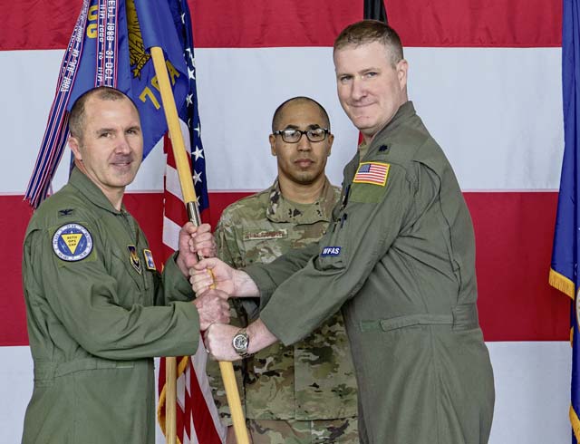 U.S. Air Force Lt. Col. John Field, 76th Airlift Squadron outgoing commander, passes the 76th AS guidon to Col. Bret Echard, 86th Operations Group commander, at Ramstein Air Base, May 10. Field relinquished command of the squadron after two years during the ceremony. Photos by Airman First Class Olivia Sampson