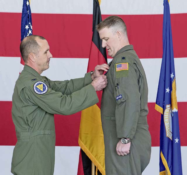 U.S. Air Force Col. Bret Echard, 86th Operations Group commander, pins a meritorious service medal on Lt. Col. John Field, 76th Airlift Squadron outgoing commander, at the 76th AS change of command at Ramstein Air Base, May 10. Field is a command pilot with over 3,800 flight hours in the C-17 Globemaster III, Gulfstream V, Gulfstream III, Raytheon T-1 Jayhawk and T-6A Texan II aircraft.