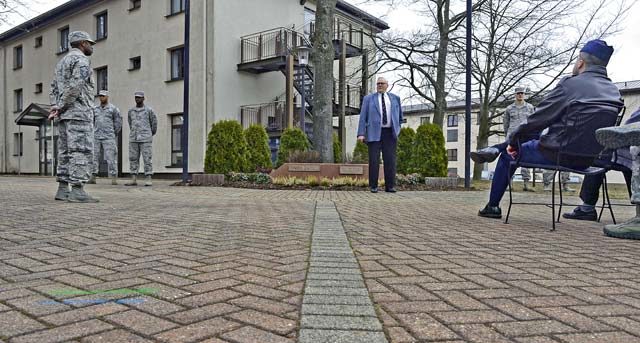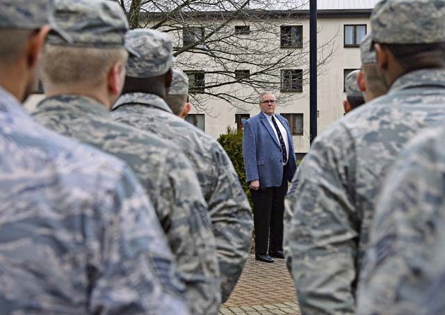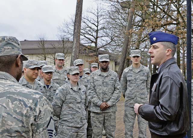 Lt. Col. Richard D. Engelman, 786th Civil Engineer Squadron commander, briefs his Airmen about the history of the River Rats Memorial monument Feb. 17 on Ramstein. The monument was established by Red River Rats Fighter Pilots Association Ramstein in 1976 to commemorate those who lost their lives in the Vietnam War.