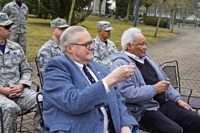 Retired Col. Swede Seagren, a Vietnam War veteran and original member of the Red River Rats Fighter Pilots Association, gives a speech in front of the Red River Memorial monument Feb. 17. The monument serves as a reminder of those who lost their lives in the Vietnam War. The 786th Civil Engineer Squadron repaired the monument in January and held a memorial service to mark its re-dedication.