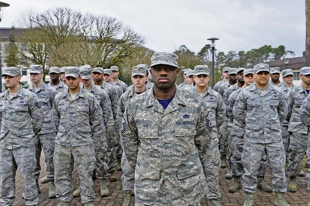 Airmen from the 786th Civil Engineer Squadron stand at parade rest during a memorial service for the River Rats Memorial monument Feb. 17 on Ramstein. The Red River Rats Fighter Pilots Association, which was formed during the Vietnam War, established the monument at Ramstein in 1976 to commemorate Airmen who never returned from Vietnam.