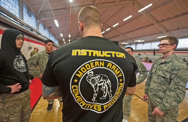 U.S. Air Force Staff Sgt. Joseph Everett (top), 86th Aircraft Maintenance Squadron, bouts with an Army soldier during the 7th Mission Support Command’s Army Combatives Tournament Dec. 4 on Kleber Kaserne.