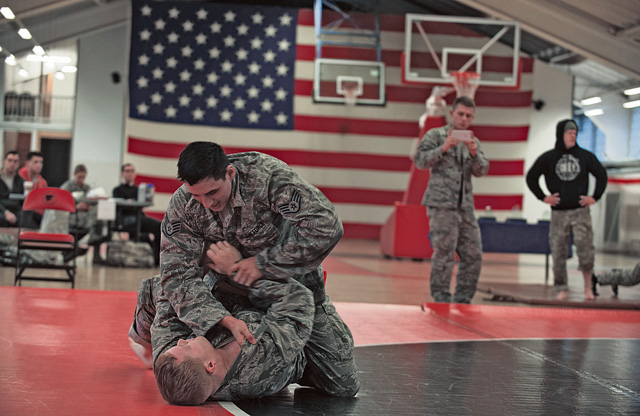 U.S. Air Force Staff Sgt. Anthony Qujada (top) bouts with Airman 1st Class Jonathon Douglas during the 7th Mission Support Command’s Army Combatives Tournament Dec. 4 on Kleber Kaserne.