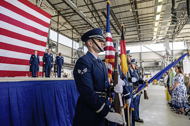 The 86th Airlift Wing Honor Guard performs colors during the 86th Airlift Wing command chief change of responsibility ceremony on Ramstein Air Base, Germany, June 12, 2025. Command Chiefs advise the commander and senior leadership on military readiness, mission effectiveness, professional development, morale, welfare, training, and good order and discipline of the wing’s 8,000 personnel. (U.S. Air Force photo by Airman 1st Class Dylan Myers)