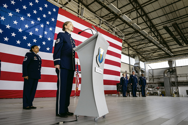 An U.S Air Force Tech Sgt. Michelle Doolittle, from the United States Air Force’s Europe band, sings the U.S. and German national anthems during the 86th Airlift Wing command chief change of responsibility ceremony on Ramstein Air Base, Germany, June 12, 2025. Command Chiefs advise the commander and senior leadership on military readiness, mission effectiveness, professional development, morale, welfare, training, and good order and discipline of the wing’s 8,000 personnel. (U.S. Air Force photo by Airman 1st Class Dylan Myers)