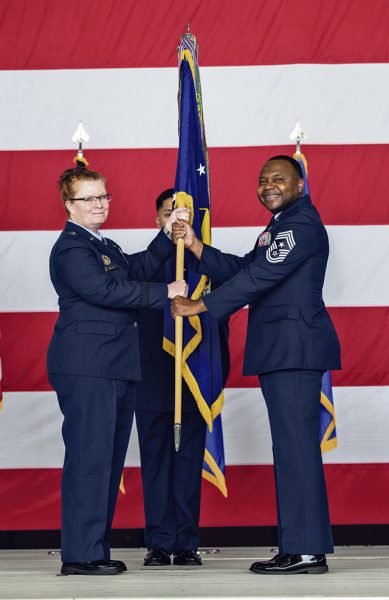 U.S. Air Force Brig. Gen. Adrienne L. Williams, 86th Airlift Wing commander, passes the guidon to Chief Master Sgt. Clifford L. Lawton, 86th AW incoming command chief, during the 86th AW’s change of responsibility ceremony at Ramstein Air Base, Germany, June 12, 2025. The passing of the guidon is a deeply symbolic tradition in the U.S. military that represents the formal transfer of authority, leadership, and trust from one senior enlisted leader to another. (U.S. Air Force photo by Airman 1st Class Dylan Myers)