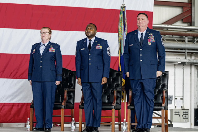 U.S. Air Force Brig. Gen. Adrienne L. Williams, 86th Airlift Wing commander, Chief Master Sgt. Clifford L. Lawton, incoming 86th AW command chief, and Chief Master Sgt. Louis Ludwig, outgoing 86th AW command chief, stand for the U.S. national anthem during the 86th AW’s change of responsibility ceremony on Ramstein Air Base, Germany, June 12, 2025. Command Chiefs advise the commander and senior leadership on military readiness, mission effectiveness, professional development, morale, welfare, training, and good order and discipline of the wing’s 8,000 personnel. (U.S. Air Force photo by Airman 1st Class Dylan Myers)