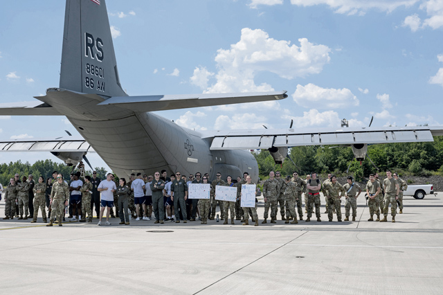 Airmen assigned to the 86th Airlift Wing wait to welcome back returning Airmen at Ramstein Air Base, Germany, July 2, 2025. Leadership and Airmen assigned to the 86 AW welcomed back members of the 37th Airlift Squadron and 86th Aircraft Maintenance Squadron from their deployment in the U.S. CENTCOM area of responsibility. (U.S. Air Force photo by Airman 1st Class Trevor Calvert)