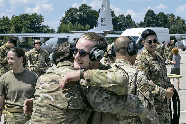U.S. Air Force Capt. Bobby Therdchitphaisarn, 86th AW Inspector General director of readiness, is welcomed home at Ramstein Air Base, Germany, July 2, 2025. The deployment consisted of two C-130J Super Hercules aircraft and 18 Airmen, completing 130 sorties and 250 flight hours in 35 days. (U.S. Air Force photo by Airman 1st Class Trevor Calvert)