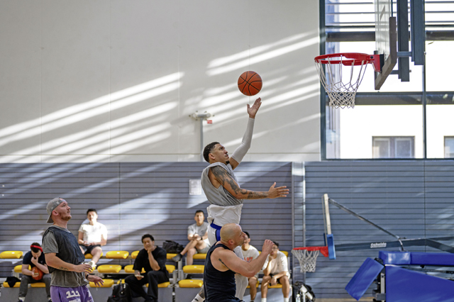 U.S. Air Force Staff Sgt. Rodney Grant, 786th Civil Engineer Squadron pavements and equipment craftsman, goes up for a layup during a basketball game at the 86th Airlift Wing Sports Day at Ramstein Air Base, Germany, Aug. 29, 2025. The sports day encouraged friendly competition amongst different units while also building morale. (U.S. Air Force photo by Airman 1st Class Jason Jones Jr.)