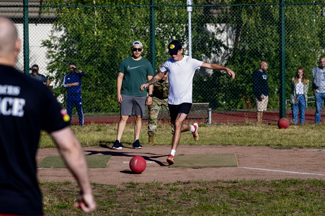 U.S. Airmen play a game of kickball at the fourth annual 86th Airlift Wing Sports Day on Ramstein Air Base, Germany, Aug. 29, 2025. Units around the installation competed against each other in various sports such as basketball, flag football, kickball, soccer and softball. The event helped foster a competitive spirit amongst the units while boosting morale. (U.S. Air Force photo by Airman 1st Class Jason Jones Jr.)