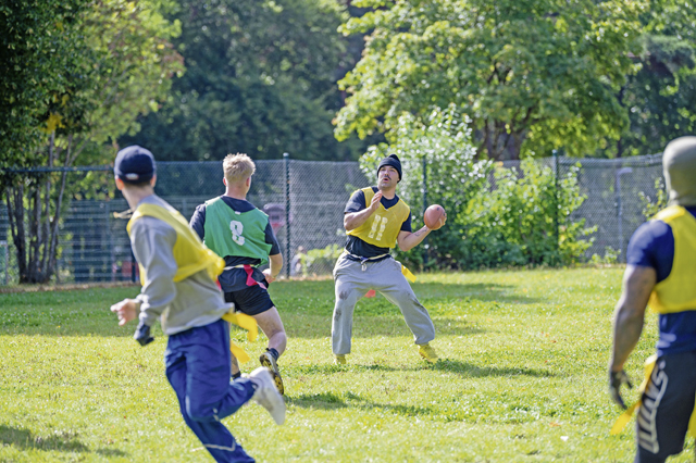 U.S. Air Force Airman 1st Class Izsac Jackson-Caperello, 86th Security Forces Squadron member, throws a pass during a flag football game at the fourth annual 86th Airlift Wing Sports Day at Ramstein Air Base, Germany, Aug. 29, 2025. Units around the installation competed against each other in various sports such as basketball, flag football, kickball, soccer, and softball. (U.S. Air Force photo by Airman 1st Class Jason Jones Jr.)