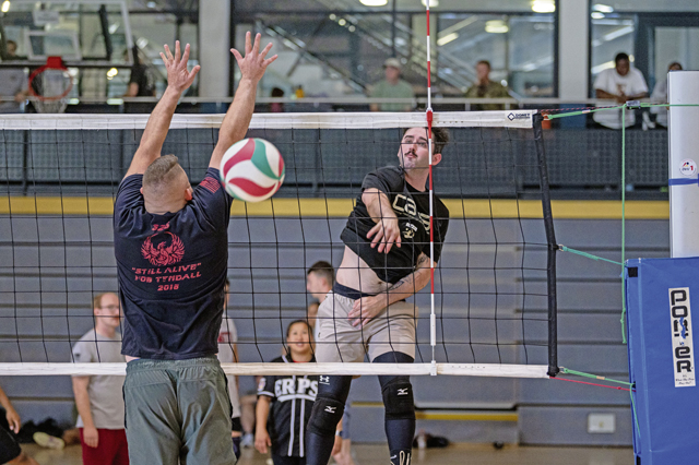 U.S. Air Force Staff Sgt. Thomas Haywald, 86th Material Maintenance Squadron logistics planner, spikes the ball during a volleyball match at the fourth annual 86th Airlift Wing Sports Day at Ramstein Air Base, Germany, Aug. 29, 2025. The sports day encouraged friendly competition amongst different units while also building morale. (U.S. Air Force photo by Airman 1st Class Jason Jones Jr.)