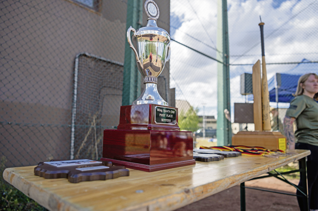 The Commander’s trophy is on display during the fourth annual 86th AW Sports Day at Ramstein Air Base, Germany, Aug. 29, 2025. Units around the installation competed against each other in various sports such as basketball, flag football, kickball, soccer, and softball. (U.S. Air Force photo by Airman 1st Class Jason Jones Jr.)