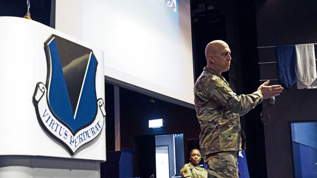 U.S. Air Force Brig. Gen. Josh Olson, 86th Airlift Wing commander, answers a question at a training event on Ramstein Air Base, Nov. 23. Olson spoke to Airmen regarding his vision as a commander and his thoughts on resiliency, which included talks on character, culture and commitment.