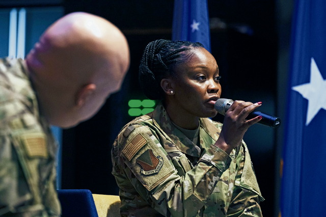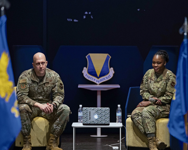 U.S. Air Force Brig. Gen. Josh Olson, left, 86th Airlift Wing commander, and Chief Master Sgt. Charmaine Kelley, 86 AW command chief, answer questions at a training event on Ramstein Air Base, Nov. 23. Olson and Kelley took the chance to address their fellow Airmen about topics such as current events, changes coming to the base, and to introduce Kelley as the new 86 AW command chief.