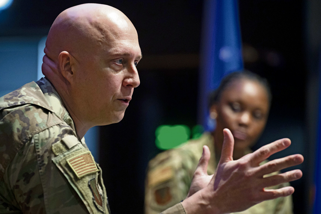 U.S. Air Force Brig. Gen. Josh Olson, 86th Airlift Wing commander, answers a question at a training event on Ramstein Air Base, Nov. 23. Olson addressed happenings on base and within European and African theaters of operation, and to say thank you to Airmen for all their hard work in recent events during the training.