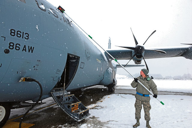 Staff Sgt. Brian Leddon, 86th Aircraft Maintenance Squadron missions systems craftsman, operates a de-icing vehicle Jan. 10 on Ramstein. More than 3 inches of snow fell in the area, prompting snow removal operations throughout the base. The operations included plowing snow, de-icing aircraft and applying salt to roads and walkways.