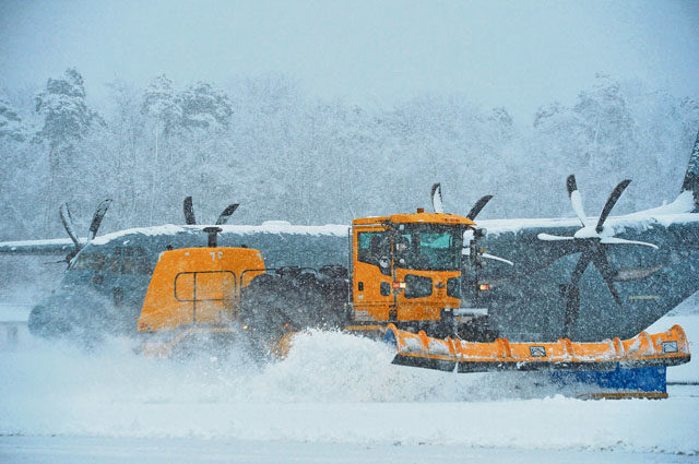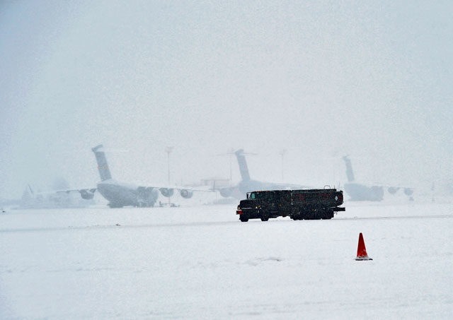 A snow plow removes snow on the flightline Jan. 10 on Ramstein. Snow removal operations commenced throughout Ramstein as continuous snow persisted throughout the majority of the day. Other snow removal operations included de-icing aircraft and applying salt to roads and walkways.