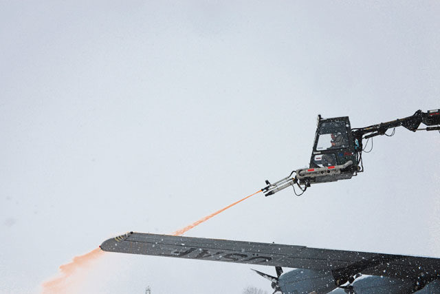 A de-icing vehicle sprays a de-icing fluid onto the wing of a C-130J Super Hercules aircraft Jan. 10 on Ramstein. Continuous snowfall prevailed throughout the majority of the day, prompting snow removal operations across the installation. The fluid helps prevent buildup of snow for a certain amount of time, especially before flight.