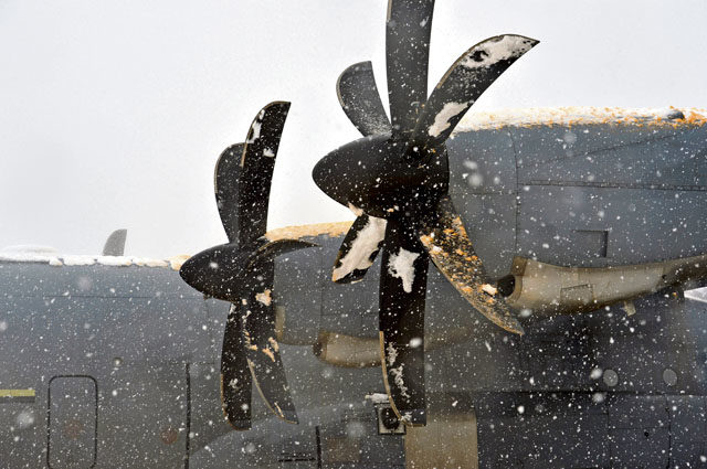 Snow and de-icing fluid stick to the propellers and engines of a C-130J Super Hercules aircraft Jan. 10 on Ramstein. The 86th Aircraft Maintenance Squadron conducted de-icing procedures on aircraft after a heavy snowfall on the installation and surrounding areas. The fluid helps prevent buildup of snow.