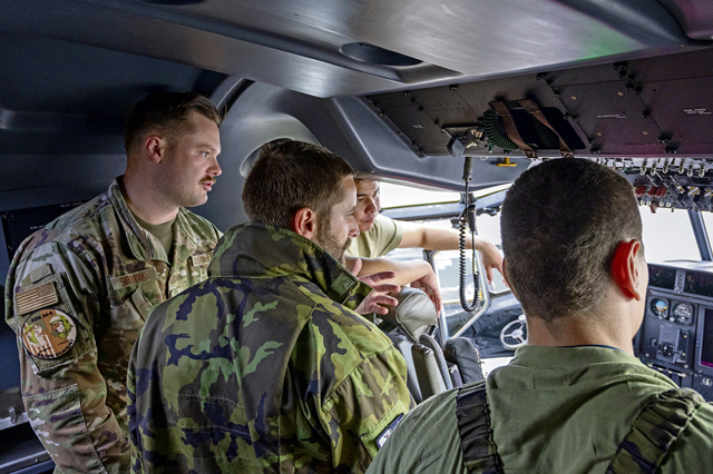 U.S. Air Force Senior Airman Alexander Wilson, 86th Aircraft Maintenance Squadron avionics technician, discusses C-130J Super Hercules capabilities with Czech air force members during Aviation Detachment Rotation 24-4, at 33rd Air Base, Poland, Sept. 10, 2024. ADR demonstrates the enduring strength of NATO relationships, ensuring Allied forces can operate together with precision and readiness to counter any threat. (U.S. Air Force photo by Senior Airman Brenden Beezley)