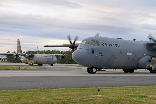 Two U.S. Air Force C-130J Super Hercules, assigned to the 86th Airlift Wing, taxi at 33rd Air Base, Poland, during Aviation Detachment Rotation 24-4, Sept. 10, 2024. ADR strengthens the NATO alliance by enhancing interoperability with the Polish air force, ensuring readiness and regional security. (U.S. Air Force photo by Senior Airman Brenden Beezley)