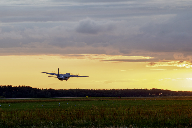 A U.S. Air Force C-130J Super Hercules, assigned to the 86th Airlift Wing, departs from 33rd Air Base, Poland, during Aviation Detachment Rotation 24-4, Sept. 10, 2024. ADR strengthens the NATO alliance by enhancing interoperability with the Polish air force, ensuring readiness and regional security. (U.S. Air Force photo by Senior Airman Brenden Beezley)