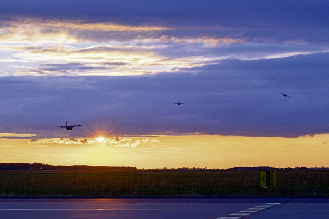 Three U.S. Air Force C-130J Super Hercules, assigned to the 86th Airlift Wing, departs from 33rd Air Base, Poland, during Aviation Detachment Rotation 24-4, Sept. 10, 2024. ADR is a bilateral training exercise with the Polish air force showcasing the ability of U.S. forces and equipment to operate in conjunction with allies and partners. (U.S. Air Force photo by Senior Airman Brenden Beezley)