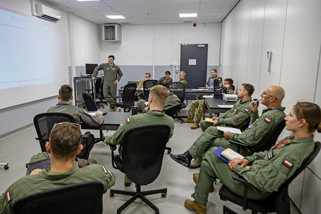 U.S. Air Force 1st Lt. Nick Routier, 37th Airlift Squadron C-130J Super Hercules pilot, gives a pre-flight brief to U.S. and Polish service members during Aviation Detachment Rotation 24-4, at 33rd Air Base, Poland, Sept. 11, 2024. ADR is a bilateral training exercise with the Polish air force designed to enhance allied interoperability, maintain readiness, and assure regional allies of NATO capabilities. (U.S. Air Force photo by Senior Airman Brenden Beezley