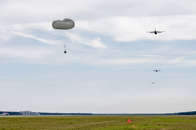 A U.S. Air Force C-130J Super Hercules, assigned to the 86th Airlift Wing, performs a low-cost low-altitude drop at 33rd Air Base, Poland, during Aviation Detachment Rotation 24-4, Sept. 11, 2024. ADR is a bilateral training exercise with the Polish air force showcasing the ability of U.S. forces and equipment to operate in conjunction with allies and partners. (U.S. Air Force photo by Senior Airman Brenden Beezley)