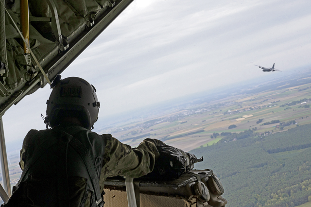 A Polish C-130H Hercules performs a low-cost low-altitude drop at 33rd Air Base, Poland, during Aviation Detachment Rotation 24-4, Sept. 11, 2024. Through combined training efforts like ADR, NATO allies strengthen their ability to collaborate effectively, enhancing military capabilities and reinforcing the collective stance that ensures security in the Baltic region. (U.S. Air Force photo by Senior Airman Brenden Beezley)
