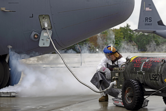 U.S. Air Force Airman 1st Class Conner Overholt, 86th Maintenance Squadron electrical and environmental journeyman, puts liquid oxygen into a C-130J Super Hercules at 33rd Air Base, Poland, during Aviation Detachment Rotation 24-4, Sept. 12, 2024. ADR is a bilateral training exercise with the Polish air force showcasing the ability of U.S. forces and equipment to operate in conjunction with allies and partners. (U.S. Air Force Photo by Airman 1st Class Trevor Calvert)