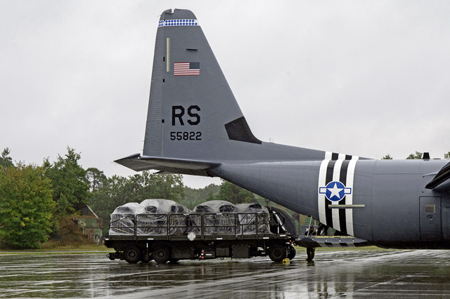 Container delivery system pallets are loaded onto a C-130J Super Hercules at 33rd Air Base, Poland, during Aviation Detachment Rotation 24-4, Sept. 13, 2024. Exercises like ADR are bilateral training events that enhance partner interoperability, maintain joint readiness, and preserve a rapid response capability essential to preserving peace and stability in the region. (U.S. Air Force Photo by Airman 1st Class Trevor Calvert)