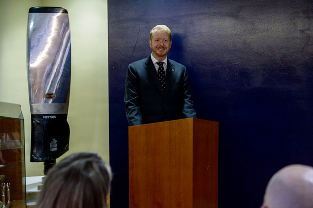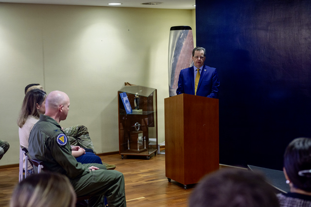 Michael Gannon, 86th Airlift Wing host nation advisor, provides opening remarks during the 86th Operations Group honorary commander induction ceremony on Ramstein Air Base, Germany, Feb. 25, 2026. The 86th OG provides resilient, agile power projection, airlift and aeromedical evacuation. (U.S. Air Force photo by Senior Airman Jason Jones Jr.)