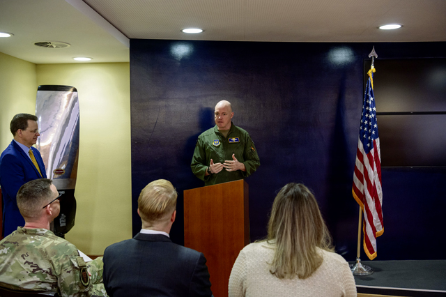 U.S. Air Force Col. Matthew Wunderlich, 86th Operations Group commander, provides opening remarks during the 86th OG honorary commander induction ceremony on Ramstein Air Base, Germany, Feb. 25, 2026. The 86th OG provides resilient, agile power projection, airlift and aeromedical evacuation. (U.S. Air Force photo by Senior Airman Jason Jones Jr.)