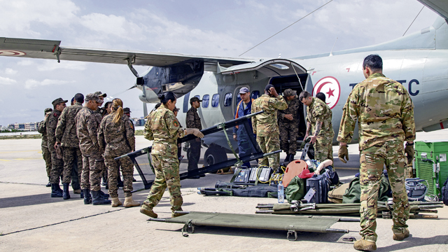 Members of the Tunisian Armed Forces secure medical equipment aboard a Tunisian L-410 Turbolet during aeromedical evacuation training at exercise African Lion 2024 (AL24) in Tunis, Tunisia, May 2, 2024. AL24 marks the 20th anniversary of U.S. Africa Command’s premier joint exercise led by U.S. Army Southern European Task Force, Africa (SETAF-AF), running from April 19 to May 31 across Ghana, Morocco, Senegal and Tunisia, with over 8,100 participants from 27 nations and NATO contingents. (U.S. Army photo by Maj. Joe Legros)