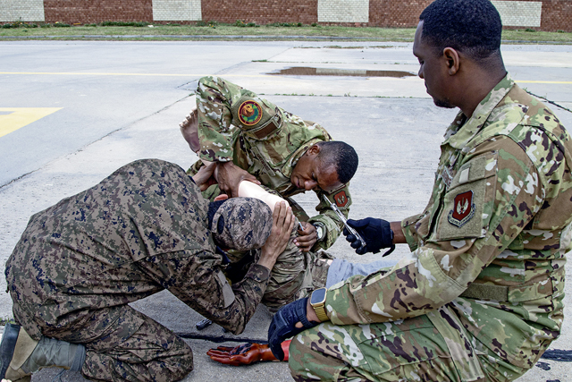 “The service member had a gastrointestinal infection a few days prior and was admitted to a local hospital until the aeromedical evacuation occurred,” said U.S Air Force Capt. Maria Oliver, 86th AES, clinical simulation element officer in charge. “The service member had a bacterial infection that resulted in complications to upper and lower extremities.”