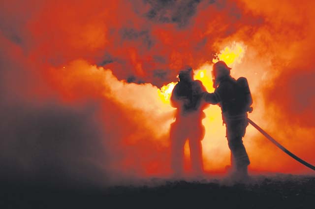 Tech. Sgt. Eric Barlow, 86th Civil Engineer Squadron fire station captain, and Airman 1st Class Kevin Williams, 86th CES firefighter, train to fight fires on a simulated burning aircraft. The 86th CES fire department Airmen train to hone their skills for real-world situations. Every October, the department hosts Fire Prevention Month where they perform presentations at KMC schools to teach children the importance of fire safety.